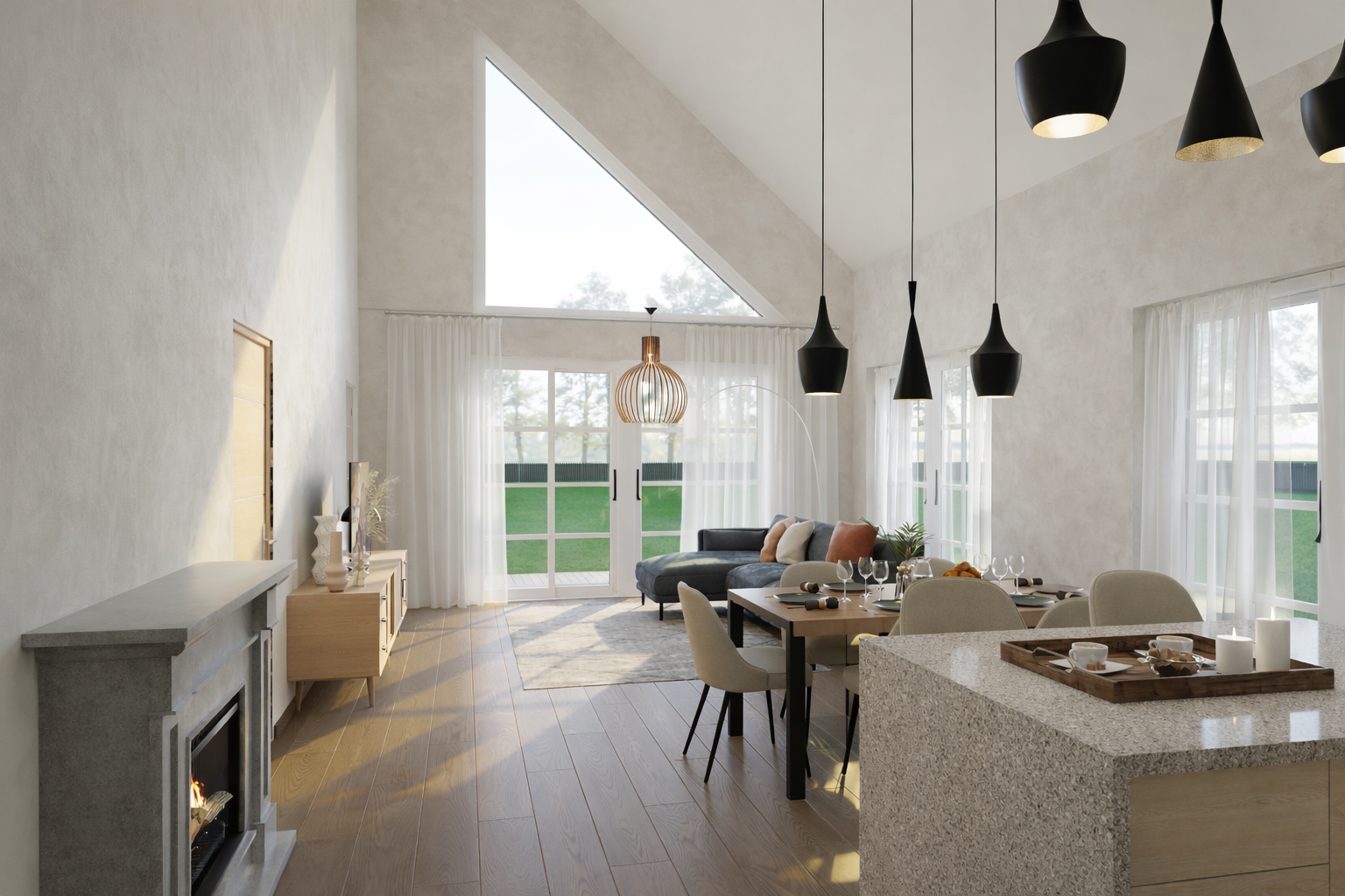Maja keskmes on kõrge laega elutuba ja köök, mida ilmestab suur kolmnurkaken – see toob ruumi erilise karakteri ning laseb loomulikul valgusel sügavale interjööri voolata. Suured klaaspinnad ühendavad siseruumi terrassi ja ümbritseva loodusega, luues tunde, et kodu ja väliskeskkond moodustavad ühtse terviku.