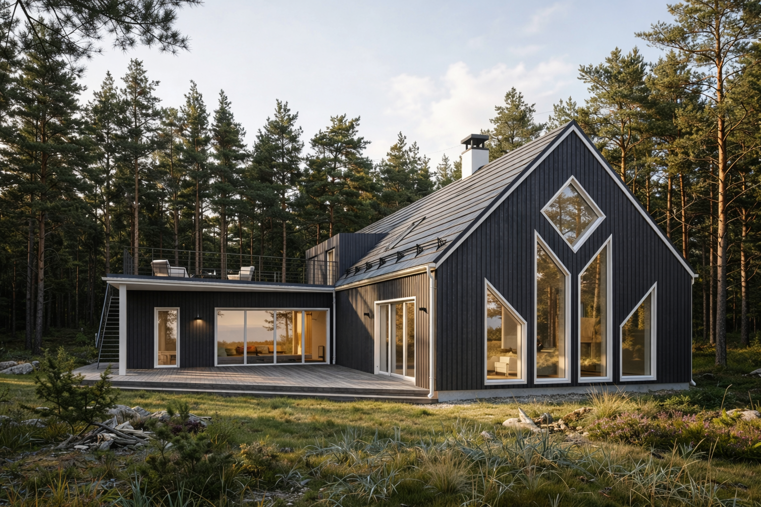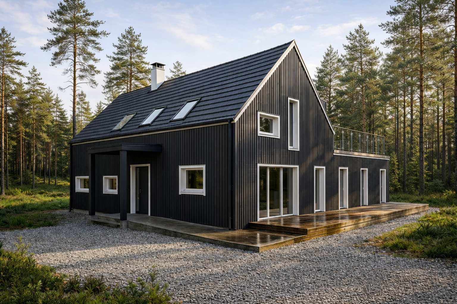 Maja koosneb kahest mahust – kõrge viilkatusega eluruumist ja madalamast, terrassiga ühendatud tiivast. Tulemuseks on kodu, mis on korraga privaatne, avar ja visuaalselt väga eriline.